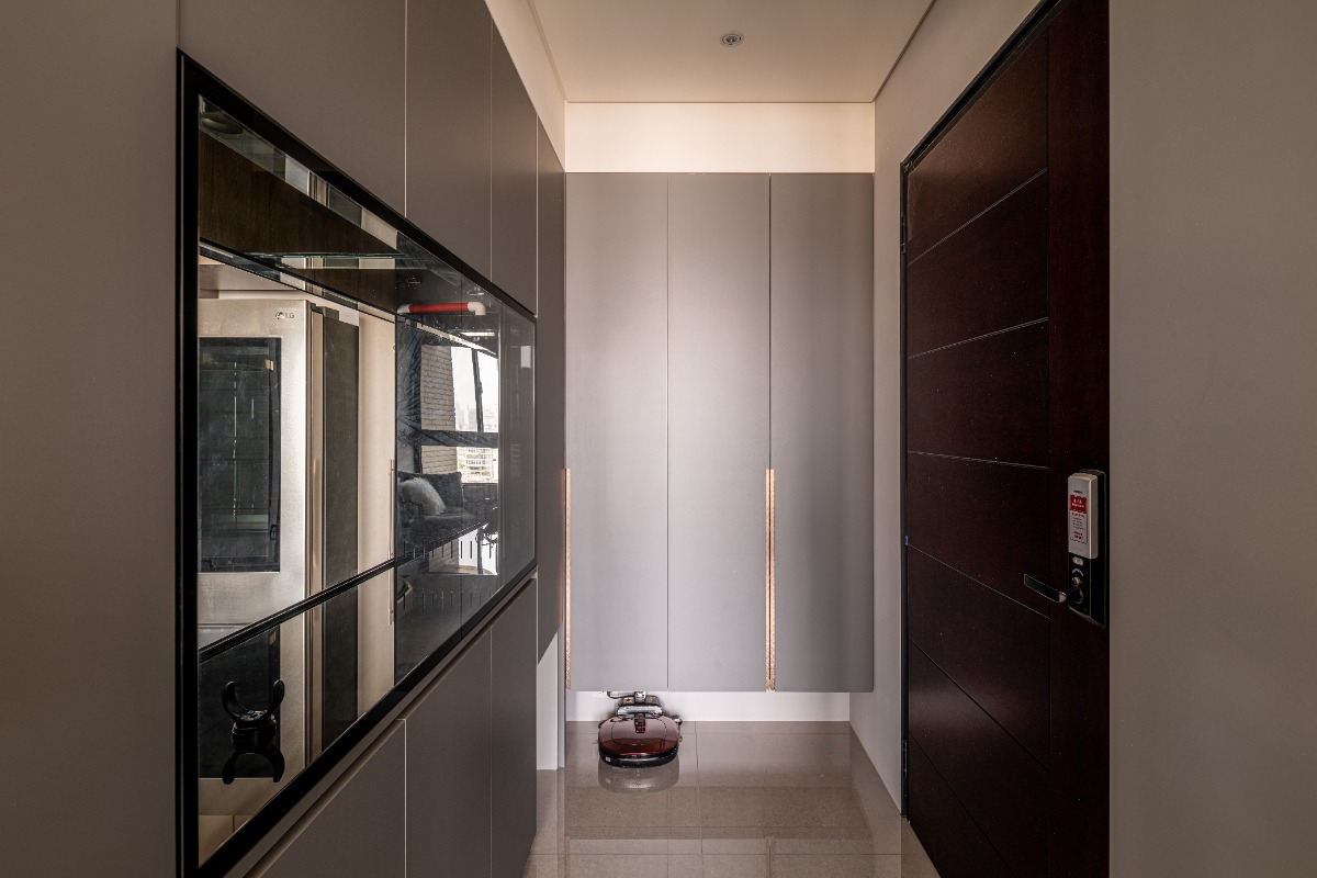 床尾以深灰玻璃及實木自然地間隔更衣室